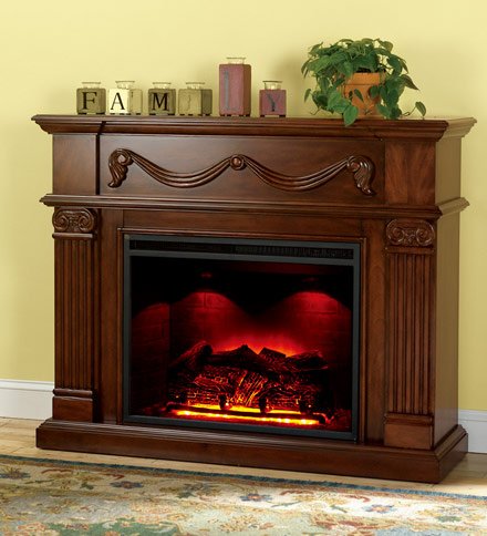 Our electric fireplaces provide the warmth and style you want in any room. They're completely vent-free and require no hookups. Features a 1,350W heater that uses a whisper-quiet fan to disperse warm air evenly, producing up to 4,600 BTU/hr. - enough to heat approximately 400 square feet. Realistic flame pattern with sparking and crackling log sounds has a brightness control for day or night viewing and operates independently of the heater, for when you want the ambiance of flickering flames without the heat. Operable glass doors, hidden controls and remote controlled. Classically designed and crafted from solid wood with wood veneers. Allen Fireplace features traditional column styling and swag detail. Easy to assemble.