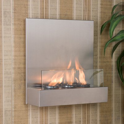 The satin stainless steel finish of this wall mount fireplace brings elegance to your home.Heating Capacity (sq. ft.): Up to 9,000 BTUsColor: Stainless SteelMaterial(s): Stainless Steel, Tempered GlassPower Source: FireGlo Gel FuelSafety Features: Tempered Glass Flame ShieldVentilation: None RequiredInstallation Required: NoAssembly Required: YesIncludes: Fireplace, FireboxDimensions: 7 1/2"D x 21"W x 22"HWeight: 22 lbs.