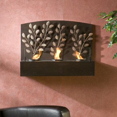 Combining a stunning antique bronze metal vine sculpture and 3 gel fuel burners, this wall mount fireplace is sure to be a mesmerizing focal point in your home. The sheer beauty of the metal art against the rich espresso finish of the fireplace is brought to life by dancing flames that create playful shadows and reflections. A decorative glass front helps create depth while protecting the flames from air currents. It also provides a convenient and unique space for burning and displaying candles when a full fire is not needed. Simply place the included snuffer cover on top of the gel fuel can openings and place candles in the firebox.Heating Capacity (sq. ft.): Up to 9,000 BTUsColor: Espresso, Antique BronzeMaterial(s): MetalPower Source: FireGlo Gel FuelVentilation: None RequiredInstallation Required: NoAssembly Required: NoIncludes: Fireplace, FireboxDimensions: 9"D x 25"W x 18 1/2"HWeight: 19 lbs.